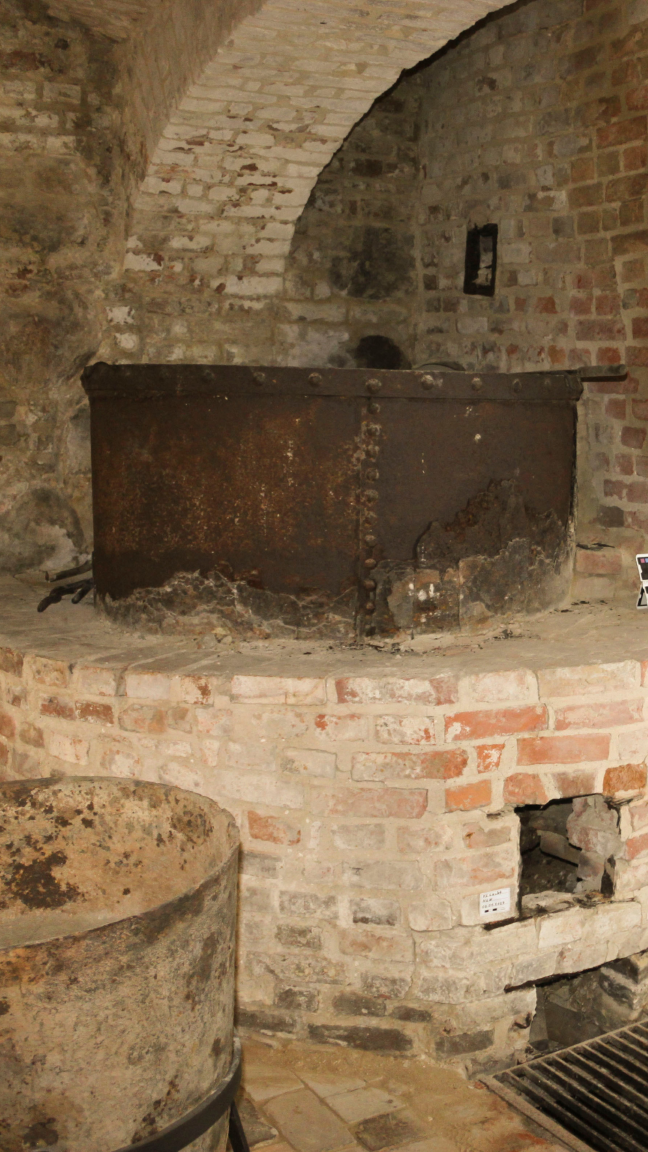 Dieser Kessel stammt vermutlich aus der Zeit, in der Caspar David Friedrichs Vater, Adolph Gottlieb Friedrich, die Seifensiederei und Lichtgießerei geführt hat, also aus dem Jahr 1765 oder aus den Folgejahren. Es ist bekannt, dass in dem Kessel im Erdgeschoss (Eldena-Raum) Tierhäute von Schlachtern ausgekocht wurden. Der daraus gewonnene Rohstoff gelangte dann in den Kessel ins Kellergewölbe.