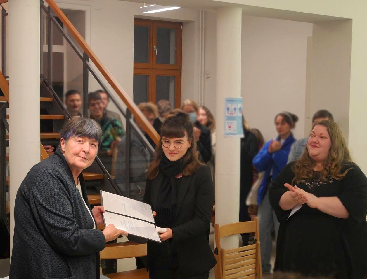 Nachdem sich die zahlreichen Besucher*innen im Haus eingefunden hatten, wurde die Preisverleihung und Vernissage mit zwei kurzen Reden vonseiten des CDF-Zentrums und der CDF-Gesellschaft, sowie mit musikalischer Untermalung eingeleitet. Im Rahmen dessen wurde der CDF-Preis mitsamt der Urkunde von der Leiterin des CDF-Zentrums, Caroline Barth, an die Preisträgerin, Johanna Herrmann, übergeben.