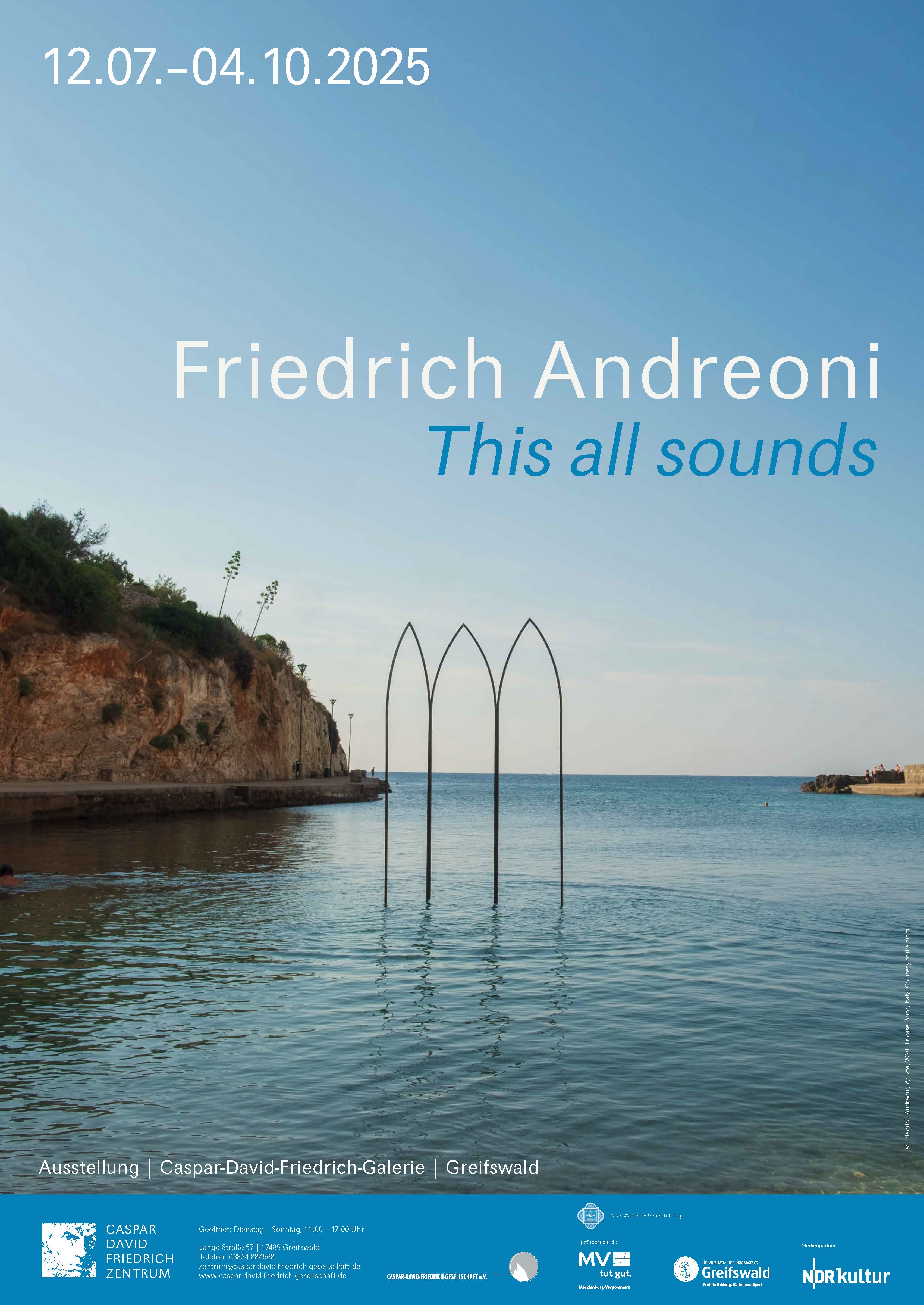 In seiner ersten institutionellen Einzelausstellung in Deutschland treffen Soundarbeiten auf Skulptur, Zeichnung, Film und Ready-mades, die sich wiederum im selben Moment zu Klang zu verwandeln scheinen. Die in Andreonis künstlerischer Praxis verhandelten Themen der Reminiszenz, Potenzialität, Spiritualität und Imagination erstrecken sich über die vier Räume des Caspar-David-Friedrich-Zentrums. Dabei werden die Räumlichkeiten mittels Sound durchflutet und miteinander verbunden.